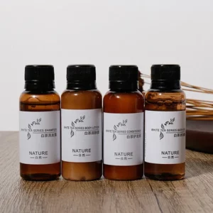 Disposable white tea shampoo, shower gel and conditioner for hotels